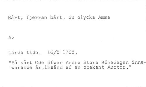 Bårt, fjerran bårt, du olycks Amma //// Av //// Lärda tidn. 16/5 1765. //// "Eå kårt Ode öfwer Andra Stora Bönedagen innewarande år,insänd af en obekant Auctor."