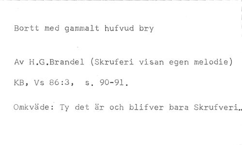 Bortt med gammalt hufvud bry //// Av H.G.Brandel (Skruferi visan egen melodie) KB, Vs 86:3, s. 90-91. //// Omkväde: Ty det är och blifver bara Skrufveri..