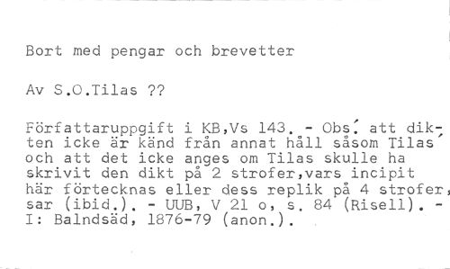 Bort med pengar och brevetter Av S.O.Tilas ?? //// Författaruppgift i KB,Vs 143. - Obs: att dikten icke är känd från annat håll såsom Tilas' och att det icke anges om Tilas skulle ha skrivit den dikt på 2 strofer,vars incipit här förtecknas eller dess replik på 4 strofer, sar (ibid.). - UUB, V 21 o, s. 84 (Risell). I: Balndsäd, 1876-79 (anon.).