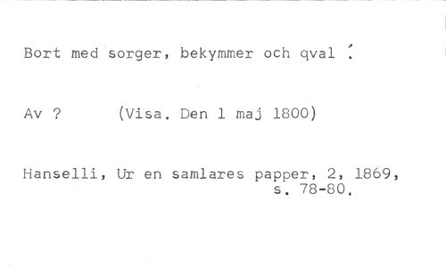 Bort med sorger, bekymmer och qval //// Av ? (Visa. Den 1 maj 1800) //// Hanselli, Ur en samlares papper, 2, 1869, //// s. 78-80.