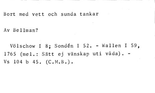 Bort med vett och sunda tankar //// Av Bellman? //// Völschow I 8; Sonden I 52. - Wallen I 59, 1765 (mel.: Sätt ej vänskap uti våda). - Vs 104 b 45. (C.M.B.).