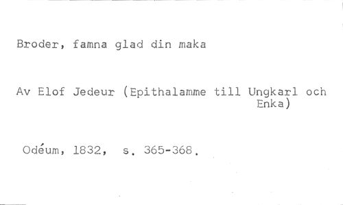 Broder, famna glad din maka //// Av Elof Jedeur (Epithalamme till Ungkarl och //// Enke) //// Odeum, 1832, s. 365-368.