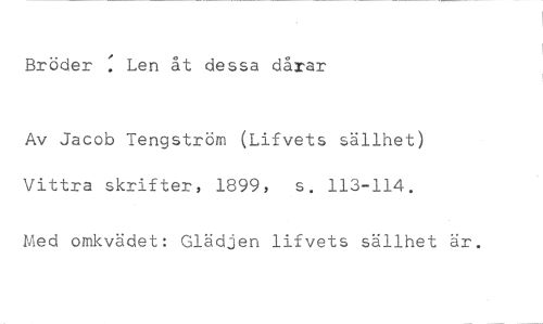 Bröder : Len åt dessa dårar //// Av Jacob Tengström (Lifvets sällhet) Vittra skrifter, 1899, s. 113-114. //// Med omkvädet: Glädjen lifvets sällhet är.