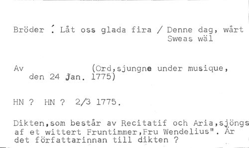 Bröder : Låt oss glada fira / Denne dag, wårt //// Sweas wäl //// Av (Ord,sjungne under musique, //// den 24 jan. 1775) //// HN ? HN ? 2/3 1775. //// Dikten,som består av Recitatif och Aria,sj.öngs af et wittert Fruntimmer,Fru Wendelius". Ar det författarinnan till dikten ?