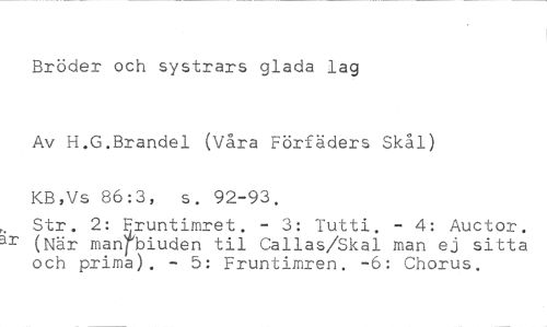 Bröder och systrars glada lag //// Av H.G.Brandel (Våra Förfäders Skål) KB,Vs 86:3, s. 92-93. //// Str. 2: Fruntimret. - 3: Tutti. - 4: Auctor. ar (När manrbiuden til Callas/Skal man ej sitta och prima). - 5: Fruntimren. -6: Chorus.