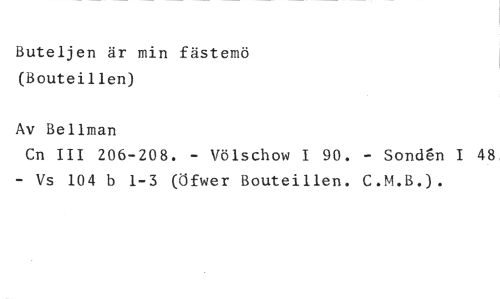 Buteljen är min fästemö (Bouteillen) //// Av Bellman //// Cn III 206-208. - Völschow I 90. - Sonden I 48 - Vs 104 b 1-3 (Öfwer Bouteillen. C.M.B.).