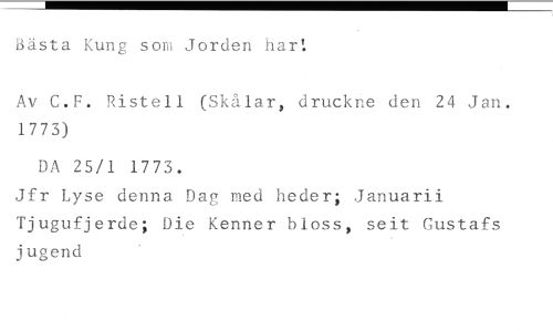 Bästa Kung som Jorden har: //// Av C.F. Ristell (Skålar, druckne den 24 Jan. 1773) //// DA 25/1 1773. //// Jfr Lyse denna Dag med heder; Januarii Tjugufjerde; Die Kenner bloss, seit Gustafs jugend