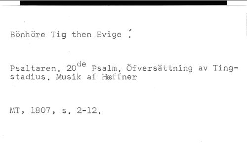 Bönhöre Tig then Evige : //// Psaltaren. 20de Psalm. Öfversättning av Tingstadius. Musik af 1-iffner //// MT, 1807, s. 2-12.