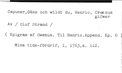 Capuner,Gäss och wildt du, Henric, Croe.sus //// gifwer //// Av / Olof Strand / ////( Epigram af Owenus. Til Henric.Append. Ep. 6 Mina tids-fördrif, 1, 1763,s. 112.