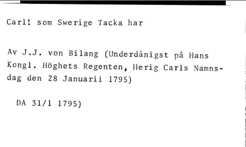 Carl! som Swerige Tacka har //// Av J.J. von Bilang (Underdånigst på Hans Kongl. Höghets Regenten, (lerig Carls Namnsdag den 28 Januarii 1795) //// DA 31/1 1795)