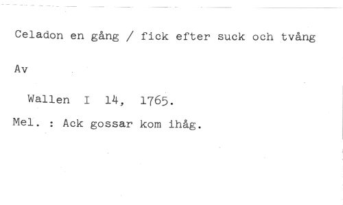 Celadon en gång / fick efter suck och tvång Av //// Wallen I 14, 1765. //// Mel. : Ack gossar kom ihåg.