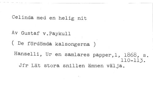 Celinda med en helig nit //// Av Gustaf v.Paykull //// ( De fördömda kalsongerna //// Hanselli, Ur en samlares papper,l, 1868, s. //// 110-113. //// Jfr Lät stora snillen ämnen välja.
