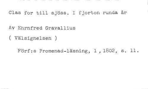 Clas for till sjöss. I fjorton runda år //// Av Ehrnfred Gravallius ( Välsignelsen ) //// Förf : s Promenad-läsning, 1 , 1802, s. 11.