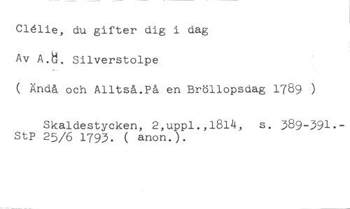 CIAlie, du gifter dig i dag Av A.j. Silverstolpe //// ( Ändå och Alltså.På en Bröllopsdag 1789 ) //// Skaldestycken, 2,uppl.,181k, s. 389-391.- StP 25/6 1793. ( anon.).