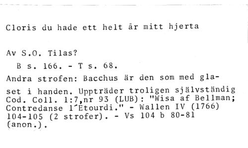 Cloris du hade ett helt år mitt hjerta //// Av S.O. Tilas? //// B s. 166. - T s. 68. //// Andra strofen: Bacchus är den som med gla- //// set i handen. Uppträder troligen självständig Cod. Coll. 1:7,nr 93 (LUB): "Wisa af Bellman; Contredanse l'Etourdi." - Wailen IV (1766) 104-105 (2 strofer). - Vs 104 b 80-81 (anon.).