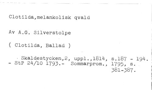 Clotilda,melankolisk qvald //// Av A.G. Silverstolpe ( Clotilda, Ballad ) //// Skaldestycken,2, uppl.,1814, s.187 - 194. - StP 24/l0 1793.- Sommarprom., 1795, s. //// 381-387.