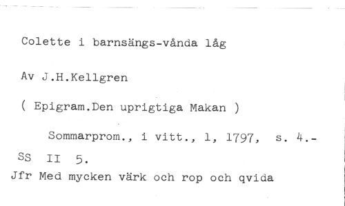 Colette i barnsängs-vånda låg //// Av J.H.Kellgren //// ( Epigram.Den uprigtiga Makan ) //// Sommarprom., i vitt., 1, 1797, s. 4.- //// Ss II 5. //// Jfr Med mycken värk och rop och qvida