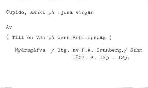 Cupido, sänkt på ljusa vingar //// Av //// ( Till en Vän på dess Bröllopsdag ) //// Nyårsgåfva / Utg. av P.A. Granberg./ Sthm //// 1807. S. 123 - 125.