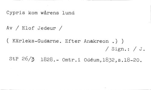 Cypris kom wårens lund Av / Elof Jedeur / ////( Kärleks-Gudarne. Efter Anakreon .) ) //// / Sign.: / J. //// StP 26/3 1828.- Omtr.i Odum,1832,s.18-20.