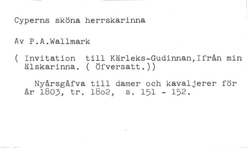 Cyperns sköna herrskarinna Av P.A.Wallmark //// ( Invitation till Kärleks-Gudinnan,Ifrån min älskarinna. ( öfversatt.)) //// Nyårsgåfva till damer och kavaljerer för år 1803, tr. 18o2, s. 151 - 152.