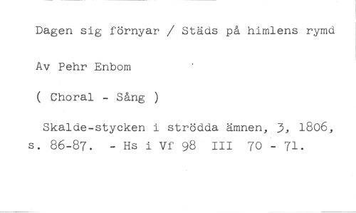 Dagen sig förnyar / Städs på himlens rymd Av Pehr Enbom //// ( //// Choral - Sång ) //// Skalde-stycken i strödda ämnen, 3, 1806, s. 86-87. - Hs i Vf 98 III 70 - 71.