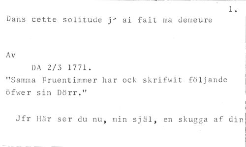 Dans cette solitude j' ai fait ma demeure //// Av //// DA 2/3 1771. //// "Samma Fruentimmer har ock skrifwit följande öfwer sin Dörr." //// Jfr Här ser du nu, min själ, en skugga af din