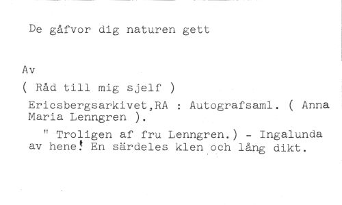 De gåfvor dig naturen gett //// Av //// ( Råd till mig sjelf ) //// Ericsbergsarkivet,RA : Autografsaml. ( Anna Maria Lenngren ). //// Troligen af fru Lenngren.) - Ingalunda av /lene! En särdeles klen och lång dikt.