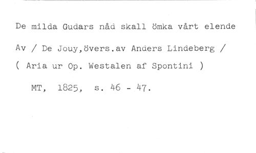 De milda Gudars nåd skall ömka vårt elende //// Av / De Jouy,övers.av Anders Lindeberg / ( Aria ur Op. Westalen af Spontini //// MT, 1825, s. 46 - 47.
