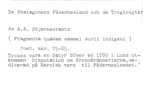 De Phatagoners Fädernesland och de Troglodyte //// Av A.A. Stjernecrantz //// ( Fragmenta qumdam sammel surii indigeni ) Poet. skr. 75-85. //// Tyckes vara en Satyr öfver en 1780 i Lund utkommen Disputation om KronoBrännerierna,dedicerad på Heroisk vers til Fäderneslandet."