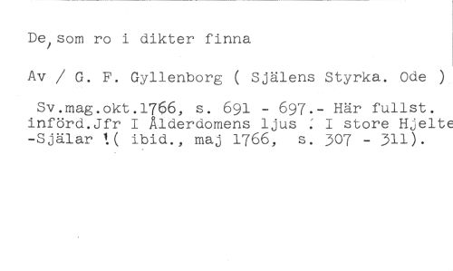 De som ro i dikter finna //// Av / G. F. Gyllenborg ( Själens Styrka. Ode ) //// Sv.mag.okt.1766, s. 691 - 697.- Här fullst. //// införd.Jfr I Ålderdomens ljus I store Hjelte //// -Själar 1( ibid., maj 1766, s. 307 - 311).
