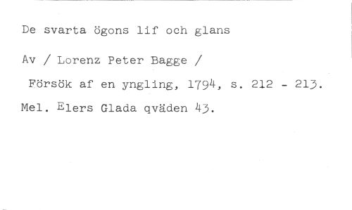 De svarta ögons lif och glans //// Av / Lorenz Peter Bagge / ////Försök af en yngling, 1794, s. 212 - 213. Mel. Elers Glada qväden 43.