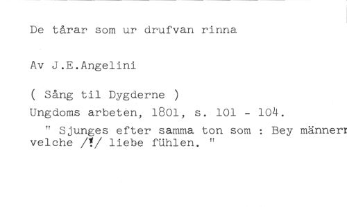 De tårar som ur drufvan rinna Av J.E.Angelini //// ( Sång til Dygderne ) //// Ungdoms arbeten, 1801, s. 101 - 104. //// Sjunges efter samma ton som : Bey männerr velche /1/ liebe fUhlen. "