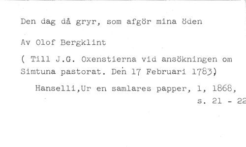 Den dag då gryr, som afgör mina öden Av Olof Bergklint //// ( Till J.G. Oxenstierna vid ansökningen om Simtuna pastorat. Den 17 Februari 1783) //// Hanselli,Ur en samlares papper, 1, 1868, //// s. 21 - 22