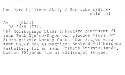 Den Dyra Hjältens Skål, / Som icke själfs- //// wåld tål //// Av (Skål) //// DA 23/9 1772. //// "Då Norrköpings Stads Inbyggare gemensamt firede Tacksäjelse-Dagen och gladdes öfwer Den Stormägtigste Konung Gustaf Den 3:djes wisa samt under den Allmägtiges beskydd fullbordade anstalter, til en sann Frihets återställande, blefwo följande Rim af Sällskapet sungne."