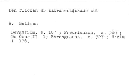 Den flickan är sakramentskade söt Av Bellman //// Bergström, s. 107 ; Fredrichson, s. 386 ; De Geer II 1; Ehrengranat, s. 327 ; Hjelm I 176.