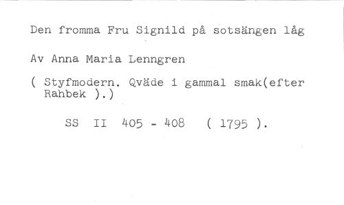 Den fromma Fru Signild på sotsängen låg Av Anna Maria Lenngren //// ( Styfmodern. Qväde i gammal smak(efter Rahbek ).) //// SS II 405 - 408 ( 1795 ).