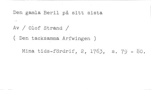 Den gamla Beril på sitt sista //// Av / Olof Strand / ////( Den tacksamma Arfwingen //// Mina tids-fördrif, 2, 1763, s. 79 - 80.
