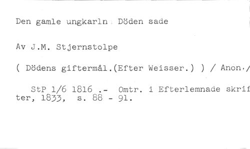 Den gamle ungkarin Döden sade //// Av J.M. Stjernstolpe //// ( Dödens giftermål.(Efter Weisser.) ) / Anon, / ////StP 1/6 1816 .- Omtr. i Efterlemnade skrik ter, 1833, s. 88 - 91.