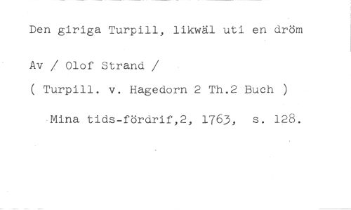 Den giriga Turpill, likwäl uti en dröm //// Av / Olof Strand / ////( Turpill. v. Hagedorn 2 Th.2 Buch ) //// Mina tids-fördrif,2, 1763, s. 128.