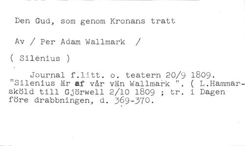 Den Gud, som genom Kronans tratt //// Av / Per Adam Wallmark ( Silenius ) //// Journal f.litt. o. teatern 20/9 1809. "Silenius är af vår vän Wallmark ". ( L.Hammarsköld till Gjörwell 2/10 1809 ; tr. i Dagen före drabbningen, d. 369-370.