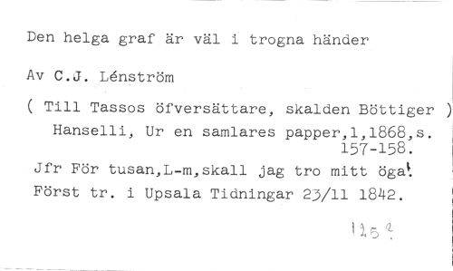 Den helga graf är väl i trogna händer //// Av C.J. LAnström //// ( Till Tassos öfversättare, skalden Böttiger //// Hanselli, Ur en samlares papper,l,1868,s. //// 157-158. //// Jfr För tusan,L-m,skall jag tro mitt ögat Först tr. i Upsala Tidningar 23/11 1842. //// 1