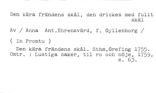 Den kära frändens skål, den drickes med fullt //// skäl //// Av / Anna Ant.Ehrensvärd, f. Gyllenborg / ( In Promtu ) //// Den kära frändens skål. Sthm,Grefing 1755. Omtr. : Lustiga saker, til ro och nöje, 1759, //// s. 63.