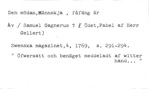 Den mödan,Männskja , fåfäng är / //// Samuel Gagnerus K ödet,Fabel af Herr Gellert) //// Swenska magazinet,4, 1769, s. 291-294. //// It öfwersatt och benäget meddeladt af vitter //// hand... "