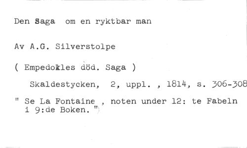 Den Saga om en ryktbar man Av A.G. Silverstolpe //// ( Empedokles död. Saga ) //// Skaldestycken, 2, uppl. , 1814, s. 306-308 //// " Se La Fontaine , noten under 12: te Fabeln i 9:de Boken. ":