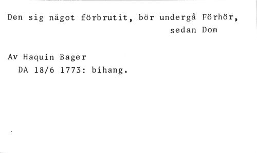Den sig något förbrutit, bör undergå Förhör, //// sedan Dom //// Av Haquin Bager //// DA 18/6 1773: bihang.