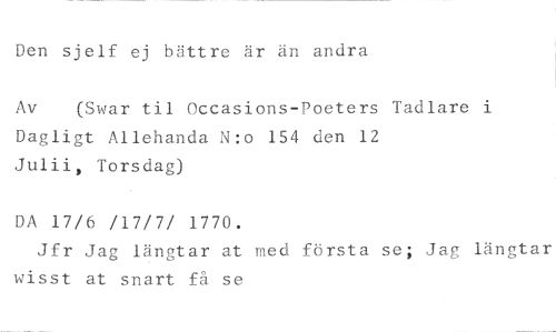 Den sjelf ej bättre är än andra //// Av (Swar til Occasions-Poeters Tadlare i //// Dagligt Allehanda N:o 154 den 12 Julii, Torsdag) //// DA 17/6 /17/7/ 1770. //// Jfr Jag längtar at med första se; Jag längtar wisst at snart få se