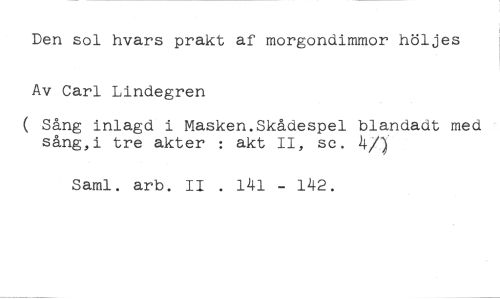 Den sol hvars prakt af morgondimmor höljes Av Carl Lindegren //// ( Sång inlagd i Masken.Skådespel blandadt med sång,i tre akter : akt II, se. 4/) //// Saml. arb. II . 141 - 142.