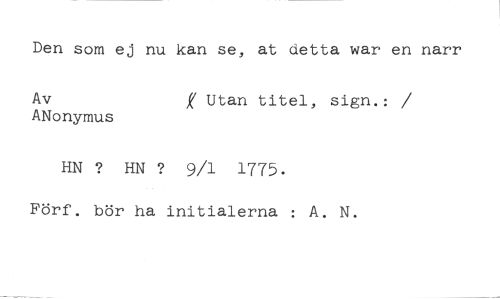 Den som ej nu kan se, at detta war en narr //// Av K Utan titel, sign.: //// /ANonymus //// HN ? HN ? 9/1 1775. //// Förf. bör ha initialerna : A. N.