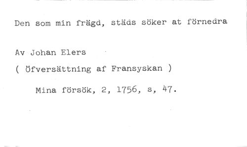 Den som min frägd, städs söker at förnedra //// Av Johan Elers //// ( öfversättning af Fransyskan ) //// Mina försök, 2, 1756, s, 47.