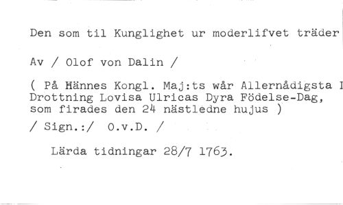 Den som til Kunglighet ur moderlifvet träder' Av / Olof von Dalin / ////( På Hännes Kongl. Maj:ts wår Allernådigsta 1 Drottning Lovisa Ulricas Dyra Födelse-Dag, som firades den 24 nästledne hujus ) //// / Sign.:/ O.v.D. / ////Lärda tidningar 28/7 1763.